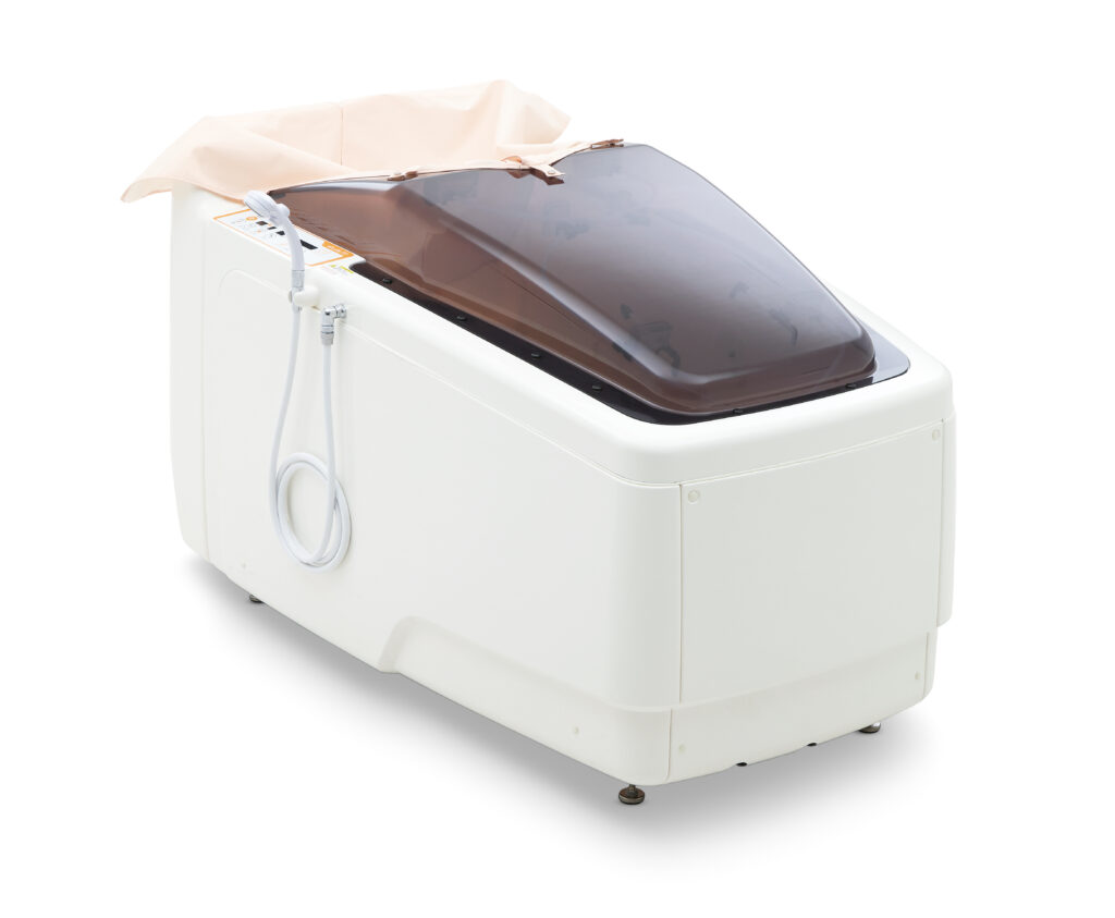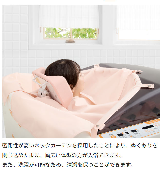 これまでご自身で歩いて浴槽内に入ることのできない方については、大浴槽にてシャワーキャリーに座って入浴していただいていましたが、どうしても胸から上、肩口がお湯の上面から出てしまうことで体が温まりにくいなどのことがありました、この度当施設(老健)では「株式会社アマノ」さんのシャワー入浴装置、今流行りの浴槽内22か所のシャワーノズルから出る、マイクロファインバブルのシャワーで全身を包み込む様に温める入浴装置を導入致しました、これからも入所及び通所サービスなど当施設のサービスを利用をされている皆様が快適なサービス利用ができる環境を整えてまいります。